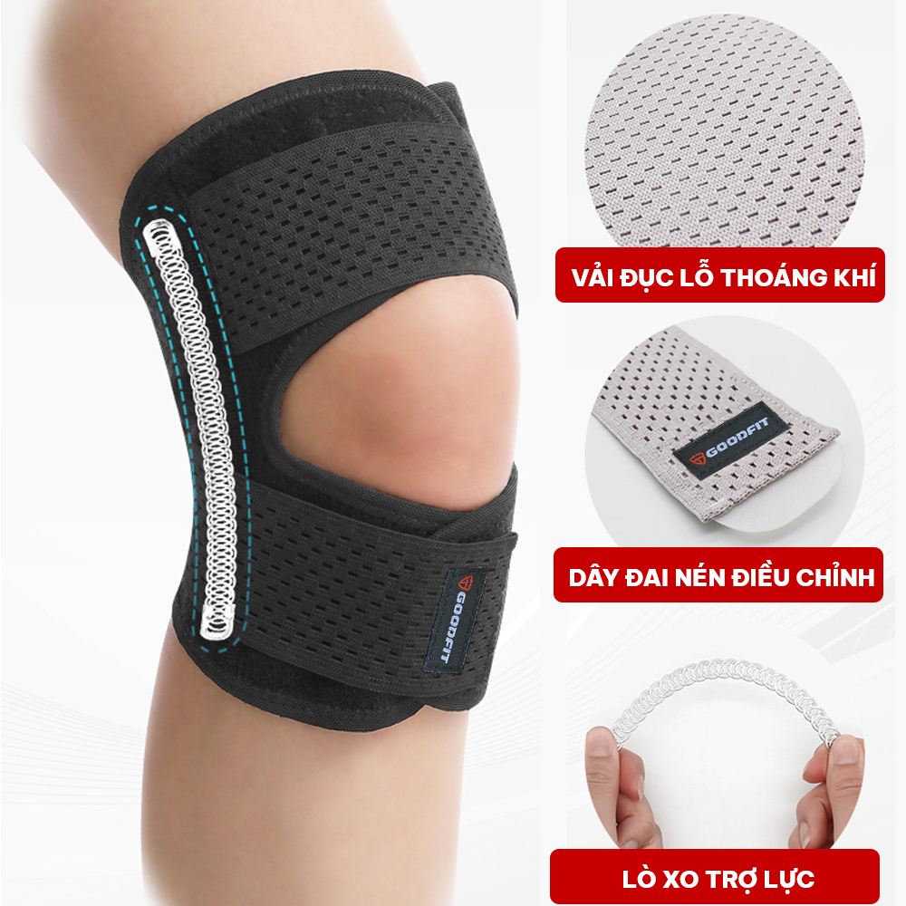 - Trợ lực khớp gối: Băng gối GoodFit GF526K có thanh lò xo 2 bên sườn ngoài việc giữ cho khớp gối không xê dịch còn trợ lực một phần khi vận động.